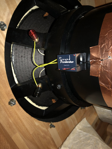 厚みを増やしたマッチ箱くらいの小さな樹脂製の黒い本体から三本のリード線が出ている。このうちの黄色の2本をスピーカーユニットの+ー端子に、黒い1本をユニットフレームなどに取り付けます。私は オーディオオート製38センチウーハー 2001-38Wの巨大なマグネット外周に銅箔を貼り付け、黒色リード線をハンダ付け、本体はマジックテープでフレームに貼り付けました。