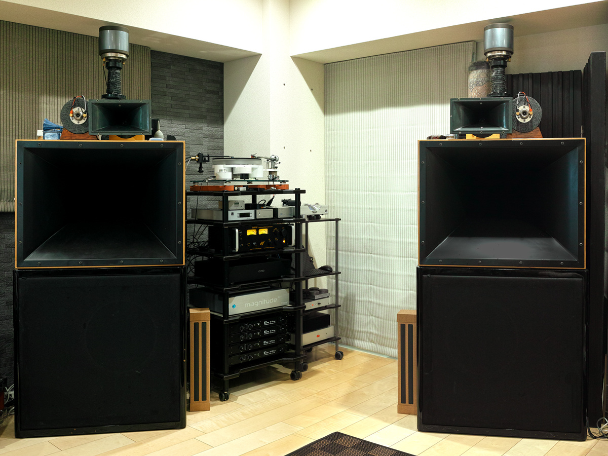残念ながら専用のオーディオルームは夢のまた夢、マンションのリビングルームに無理やりオーディオシステムを設置しているため、ウェブで散見される超マニアの皆さんの、低音部までホーンドライバを使った完全なるオールホーンマルチスピーカーは実現できません。