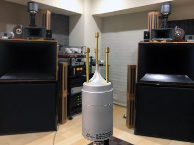 スピーカーシステムは、低音部が 「AUDIO NOTE 2001-38W」38cmウーハーを750×800×650の特注桜材ボックスに入れたもの、中低音が 「エール音響 7550 オールパーメンジュール特注ドライバ+折曲げホーン」、中高音が 「エール音響 4550 オールパーメンジュール特注ドライバ+YL CO-800ホーン」、高音が 「エール音響 1750 オールパーメンジュール特注ドライバ+ステンレスくり抜きホーン」です。