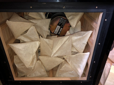 ちなみにボックスに入っているテトラ状の物体は 芦沢式吸音レゾネーターといって、スピーカーボックスに充填して吸音効果があるというもの。30年くらい前にオーディオアクセサリー誌などで紹介され、製品として販売もされていました。小型スピーカー用の小さなテトラ形状のタイプと、大型スピーカーボックス用には角柱型のがありました。当方は銀座伊東屋で仕入れた、強い繊維を練り込んだ非常にコシの強い和紙でテトラ形状のを自作しました。低音域の吸音には特に効果的なようで、ずっと使い続けています。