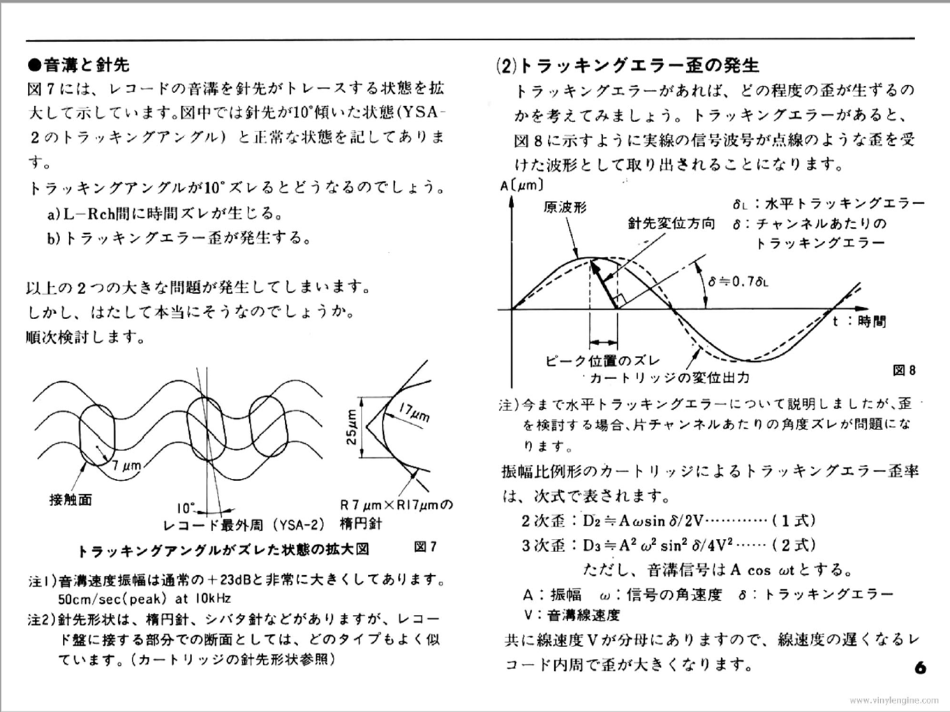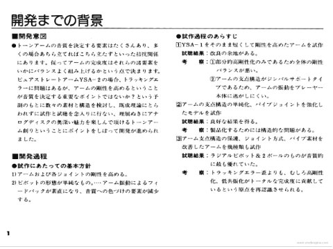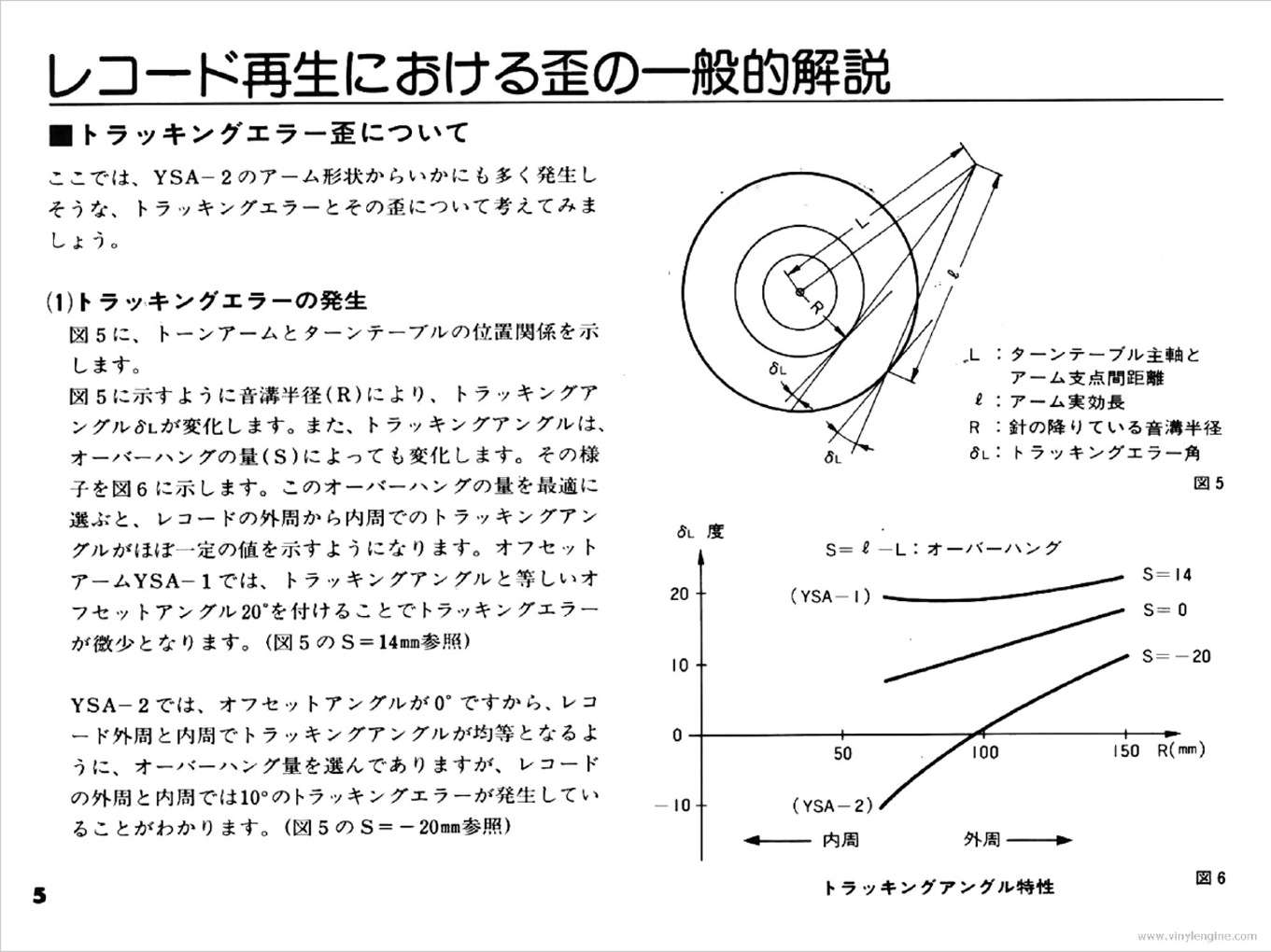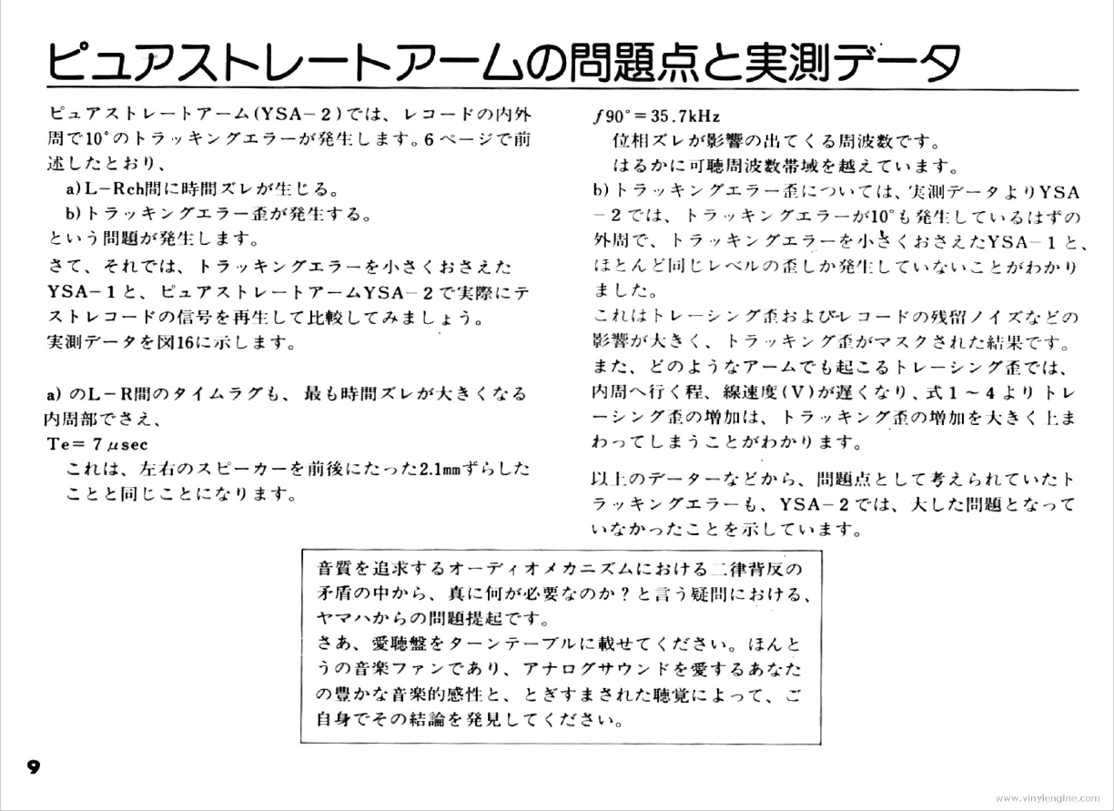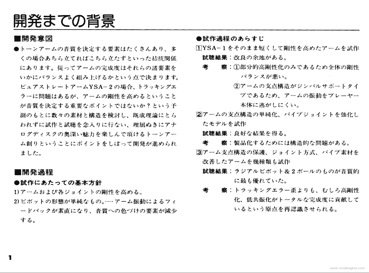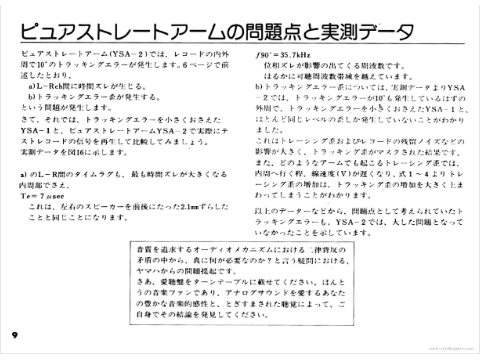 「vinylengine」という、アナログオーディオの膨大なデータベースを検索できるサイトから、 YAMAHA YSA-2 に添付されていた取扱説明書の「技術解説」をダウンロードしました。これを読むと、新製品 GT-5000にピュアストレートトーンアームを導入した「理由」が想起されます。