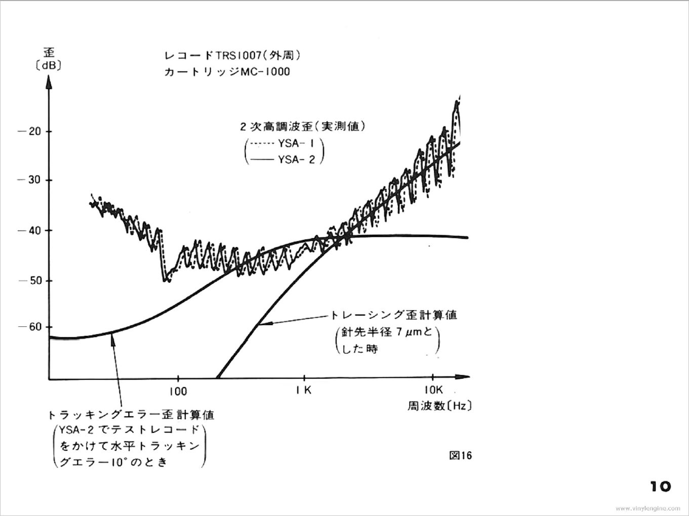 b) トラッキングエラー歪については、実測データよりYSA-2では、トラッキングエラーが10°も発生しているはずの外周で、トラッキングエラーを小さくおさえたYSA-1と、ほとんど同じレベルの歪しか発生してないことがわかります。