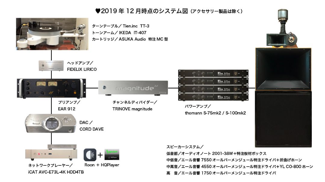 現在のこのシステム、エール音響ホーンスピーカーシステム以外、アナログターンテーブル、カートリッジ、プリアンプ、チャンネルディバイダー、パワーアンプすべてここ数年で全部変更しました。デジタル再生システムに至っては、以前は存在すらしなかったものです。